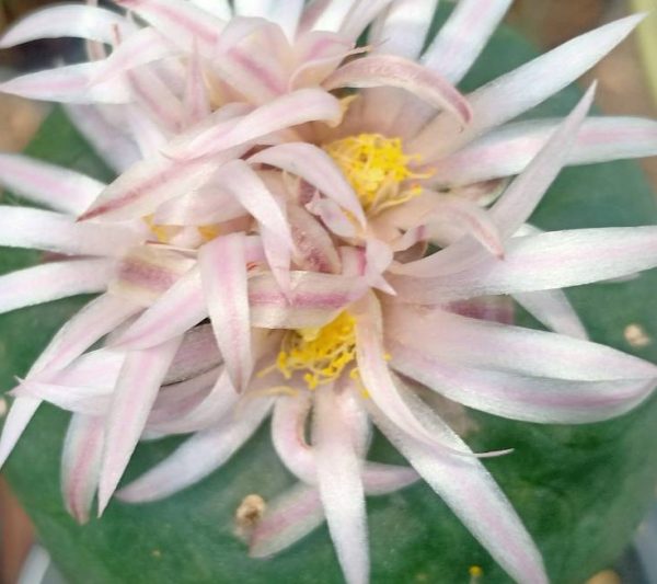The koehresii is specific by its shape, its ribs, very particular for the lophophora specie, and the particular flower that differ from other varieties. It has a kind of brownish stripe on the middle of the petal which more elongated and thin than of the other lophophoras. The seeds also is quite bigger than other while we collect them.